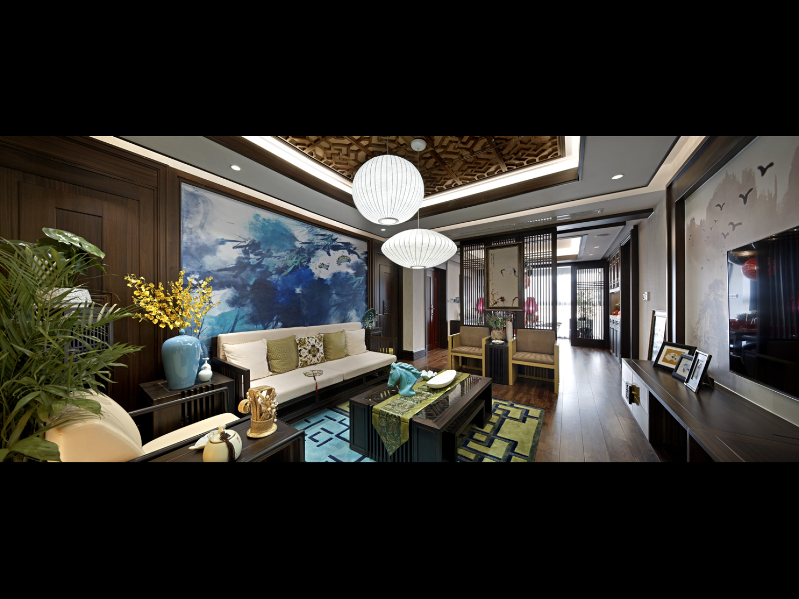 客厅,中式线条,顶面造型。色彩略微偏深,给人以沉稳的感觉。