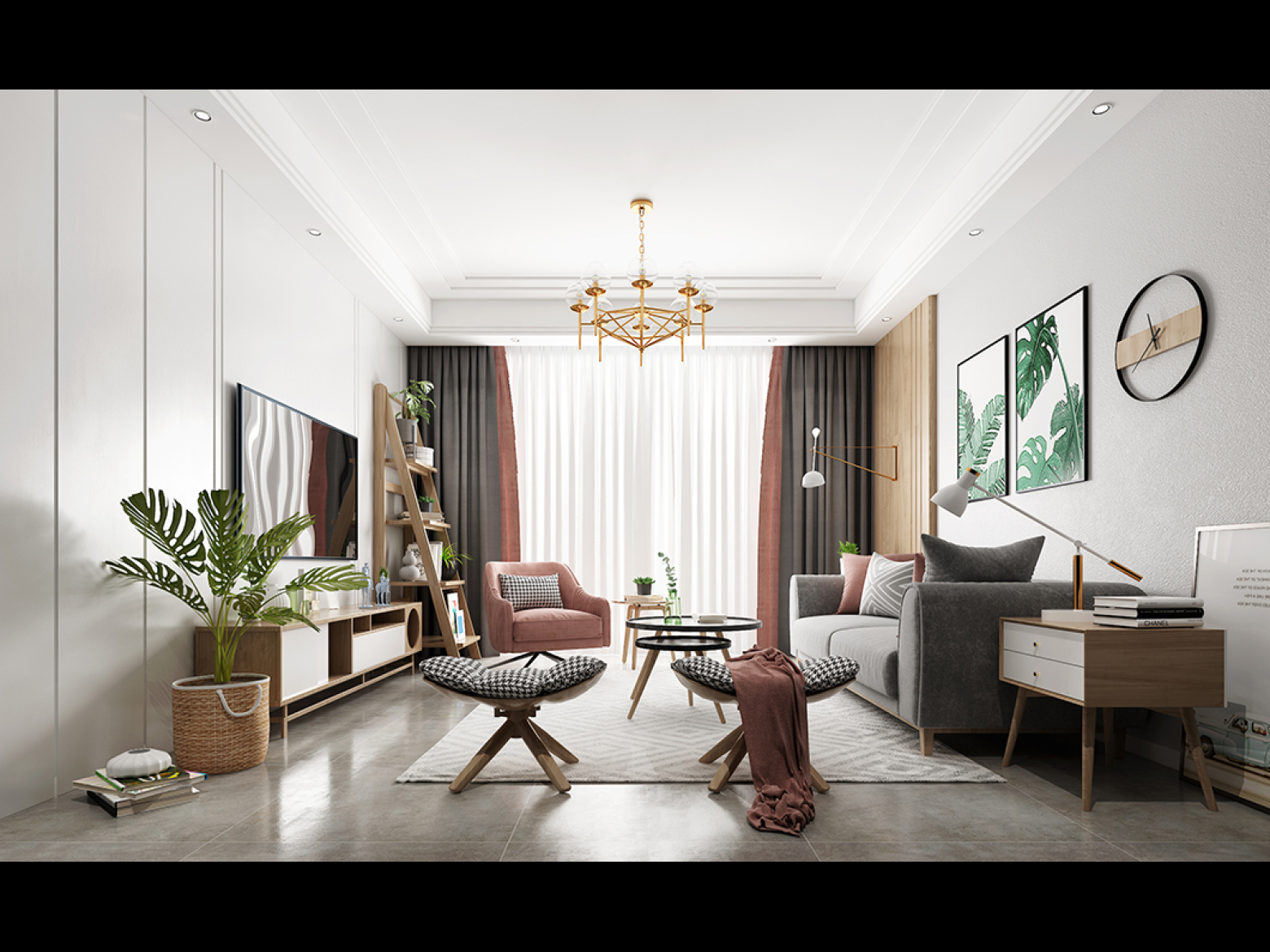 整个空间采用白色,和木色相搭配,配以阔叶装饰画和盆栽,营造了一份宁静的北欧风情