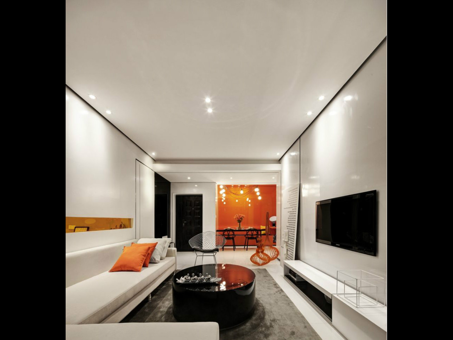 白色客厅搭配餐厅卡座的一抹橙红色显得鲜亮热情。