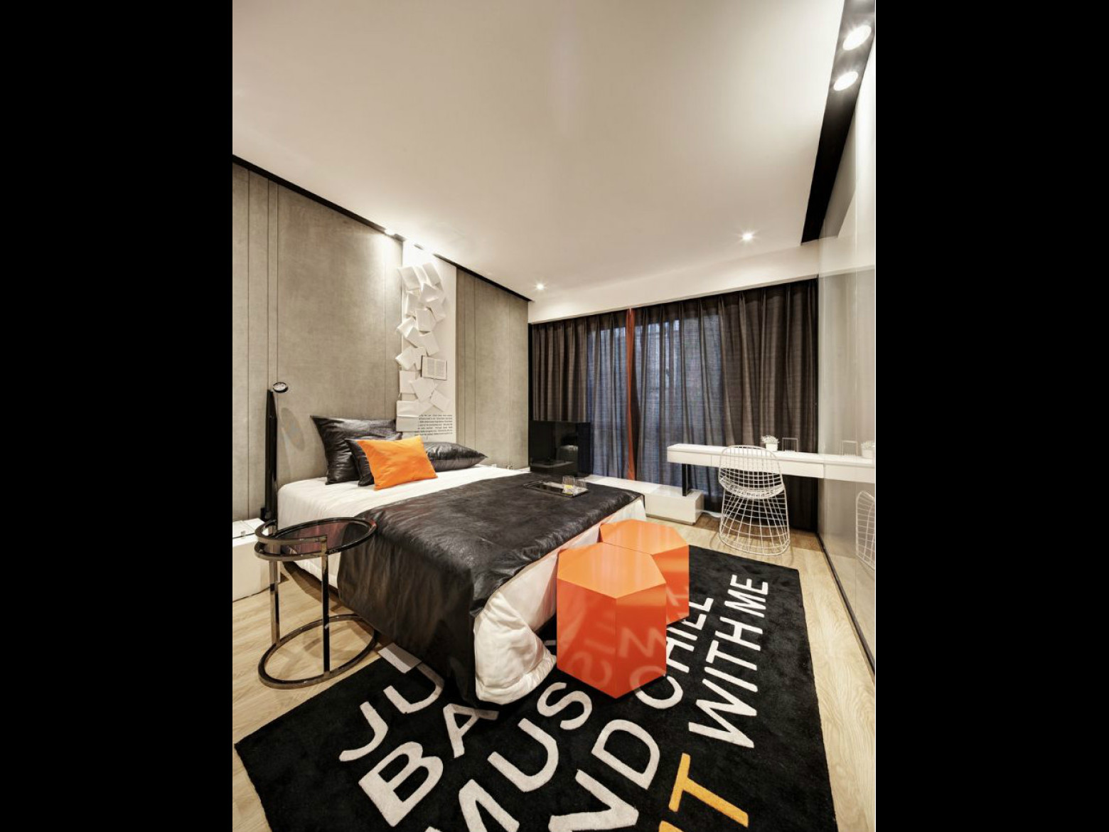 次卧的空间比较小,以白色为主调,橙色的小配饰为点缀